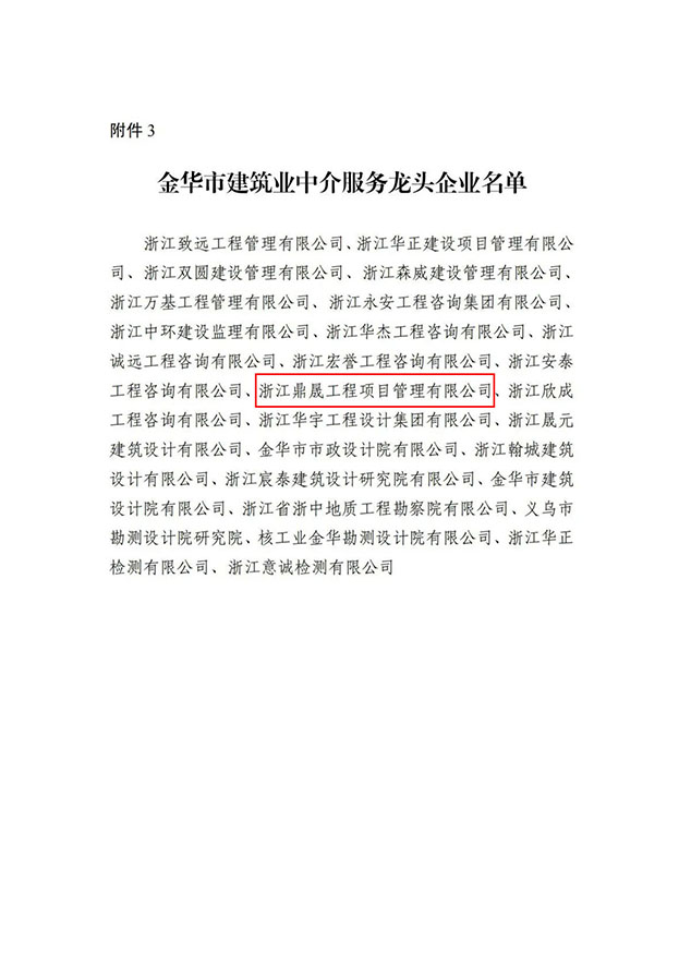 近日,金华市人民政府公布了金华市建筑业龙头骨干企业、建筑业中介服务龙头企业的名单,我司与其他共计24家企业获得“建筑业中介服务龙头企业”荣誉称号。